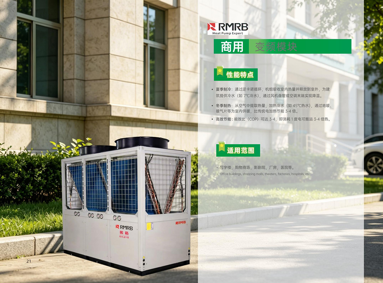 夏季制冷:通过逆卡诺循环,机组吸收室内热量并释放到室外,为建筑提供冷水(如 7℃冷水),通过风机盘管或空调末实现降温,