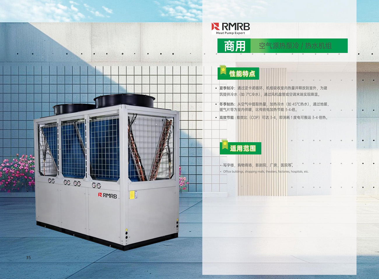冬季制热:从空气中提取热量,加热冷水(如45℃℃热水),通过地暖、暖气片等为室内供暖,比传统电加热节能 了-4倍。