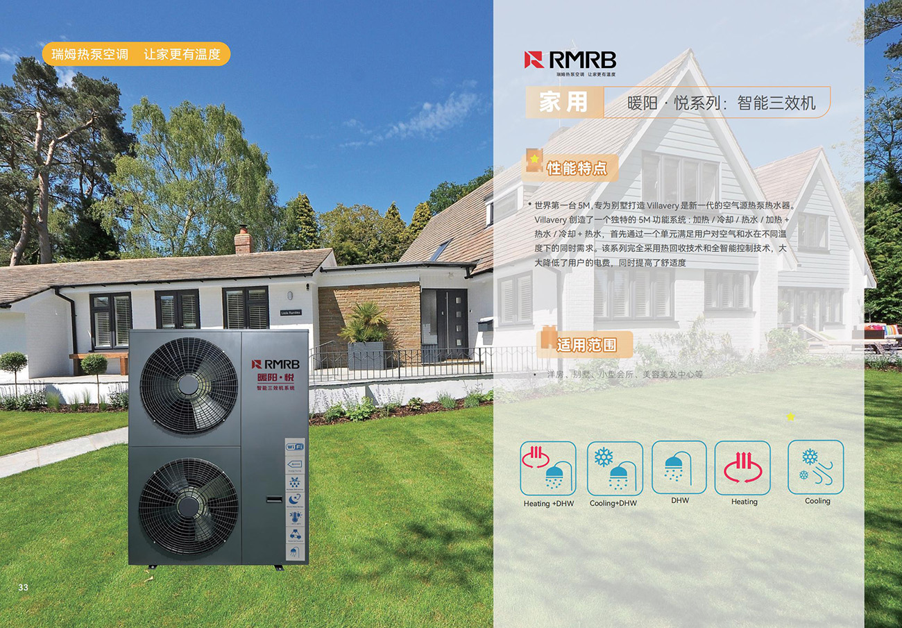 世界第一台 5M,专为别墅打造 Vilavery是新一代的空气源热泵热水器Villavery 创造了一个独特的 5M 功能系统:加热/冷却/热水/加热 +热水/冷却+热水,首先通过一个单元满足用户对空气和水在不同温度下的同时需求。该系列完全采用热回收技术和全智能控制技术,大大降低了用户的电费,同时提高了舒适度。